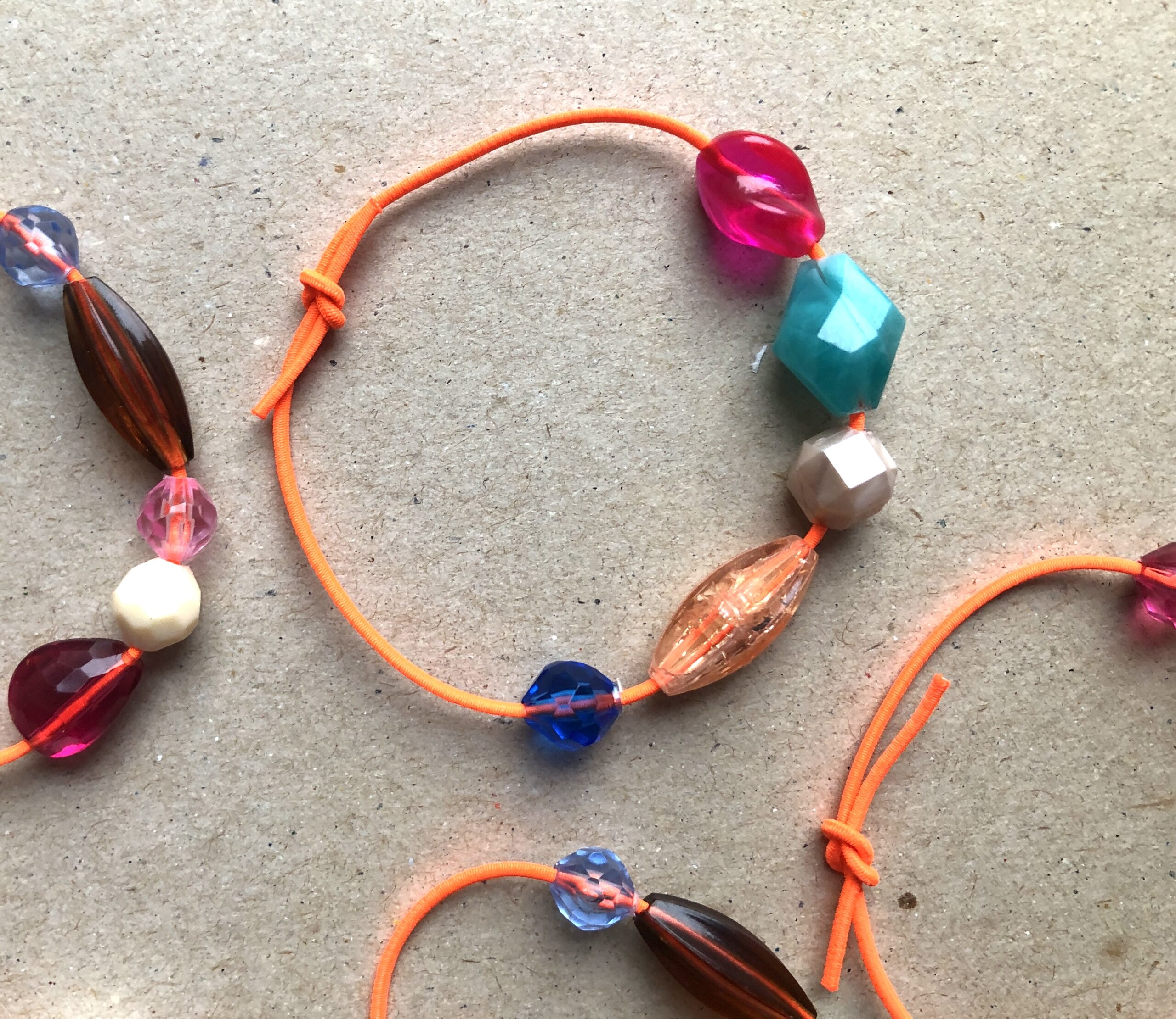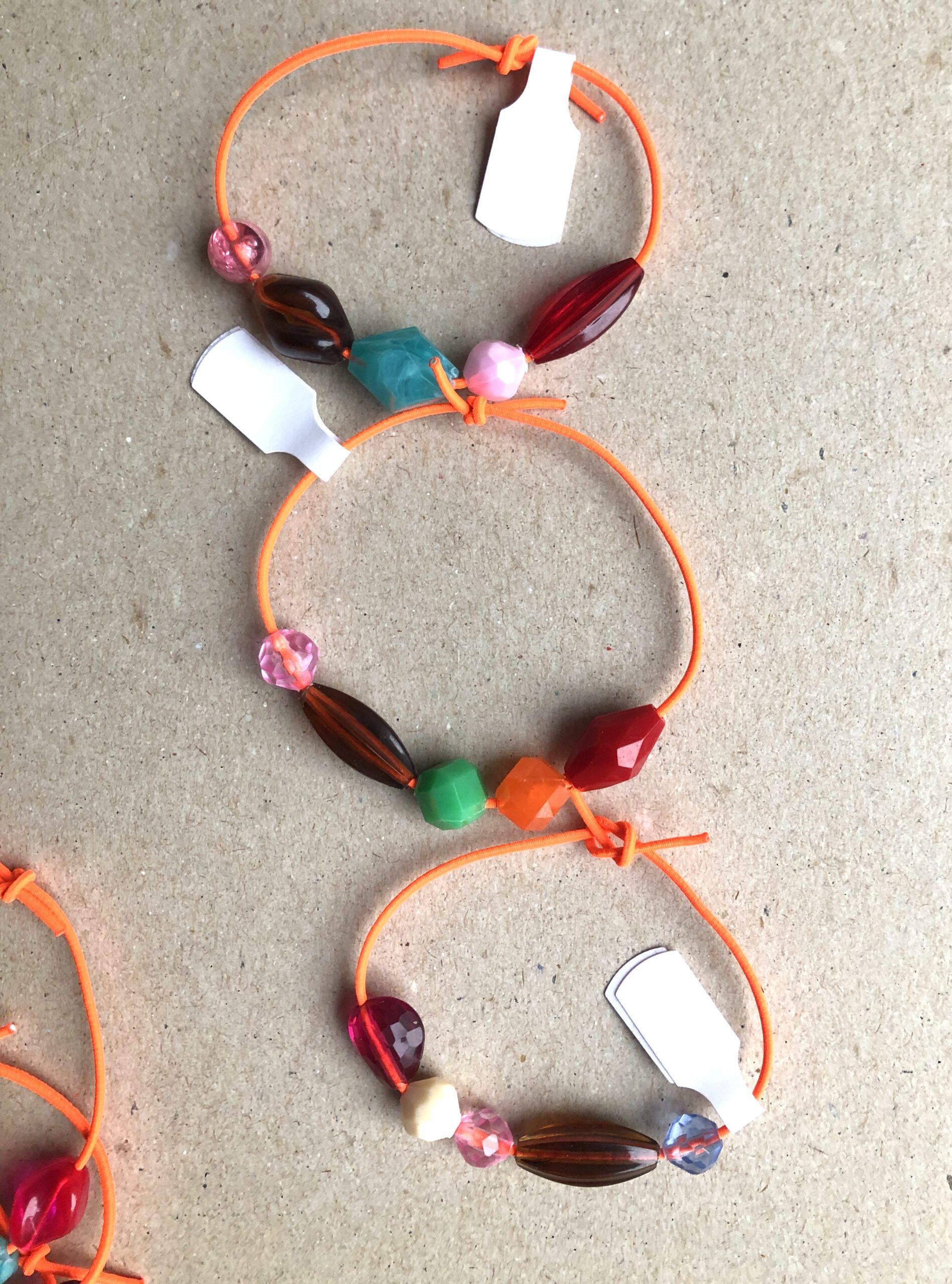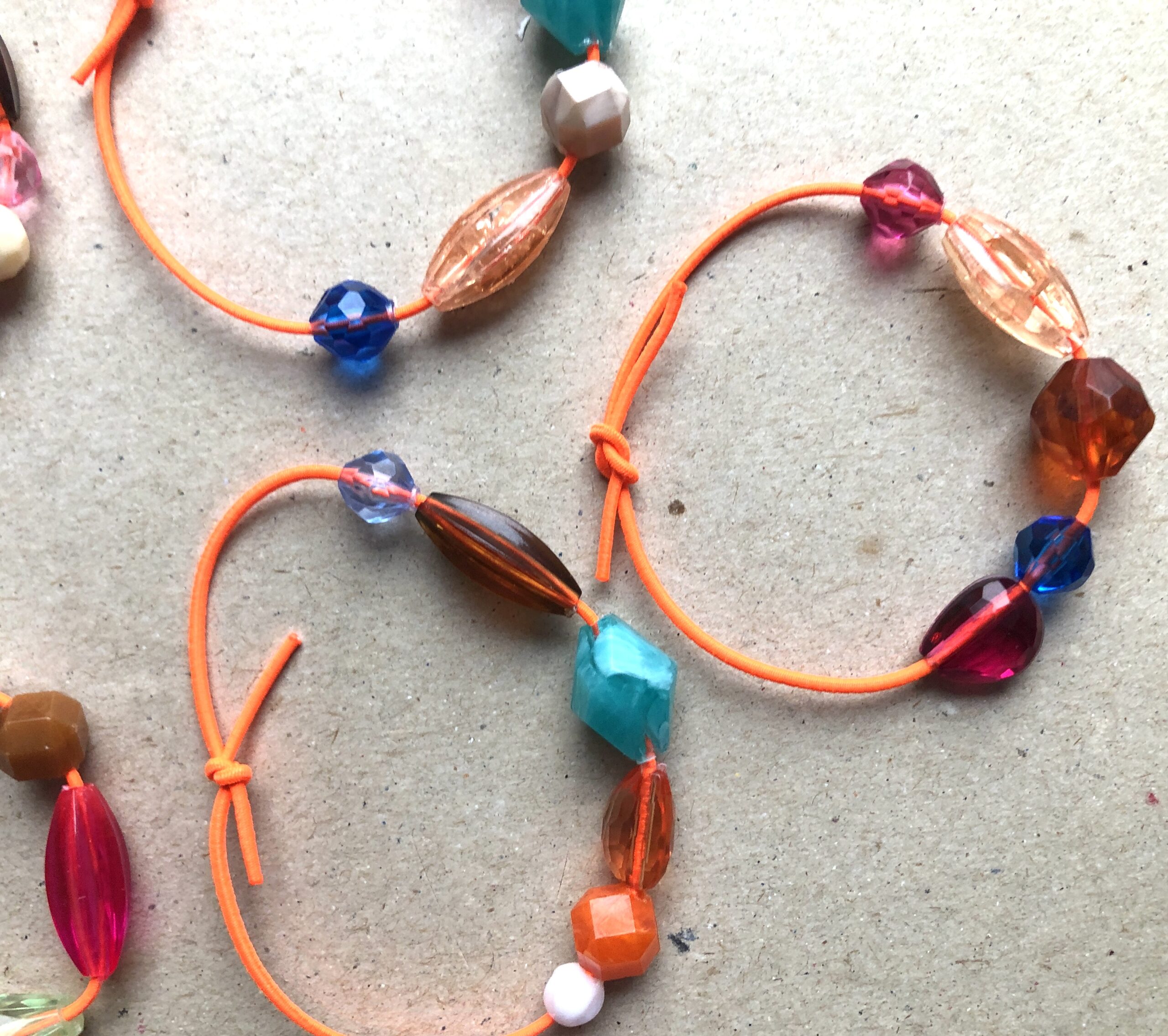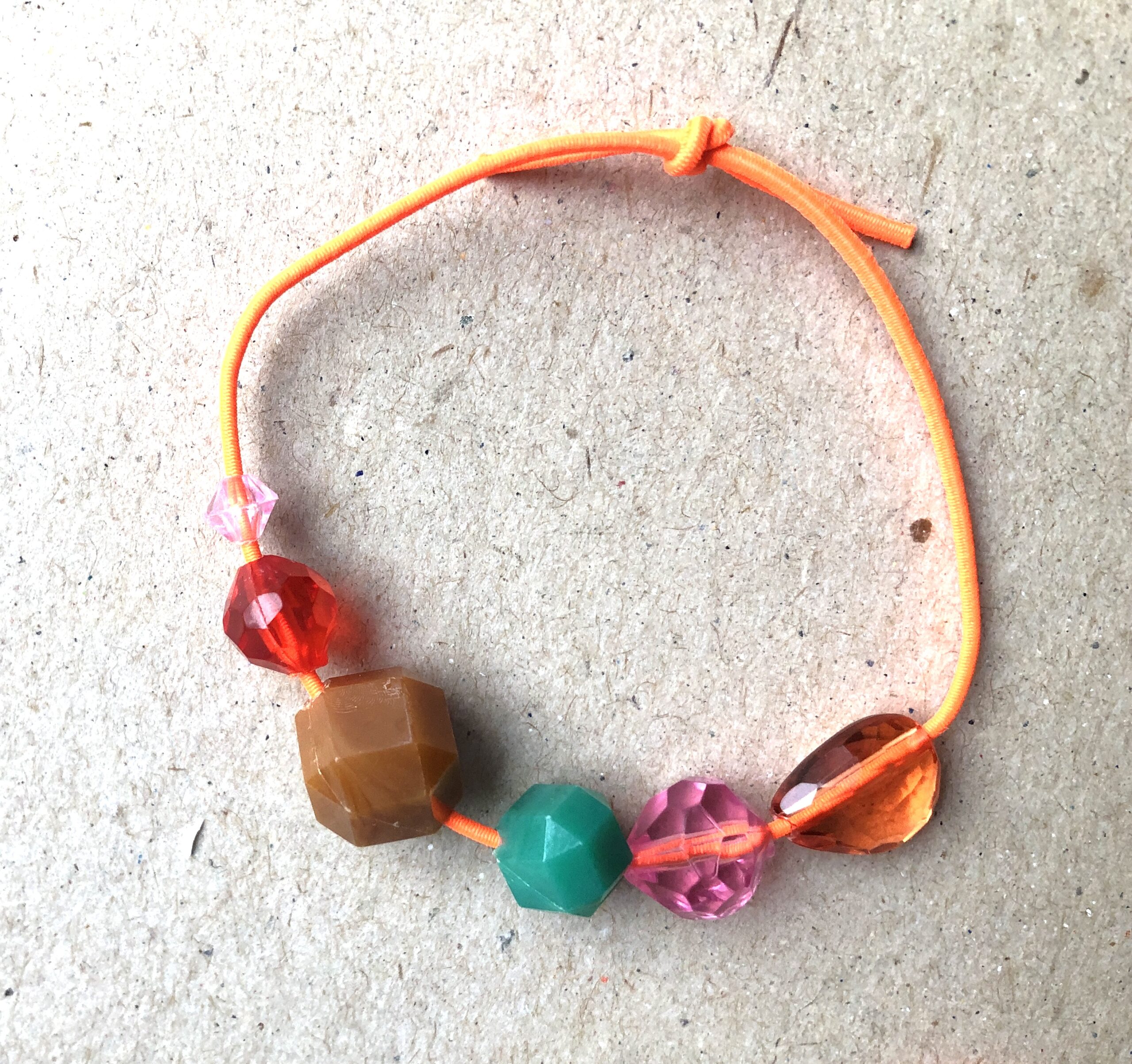 Armbändeli mit diversen Acrylperlen auf neon-orangem Gummiband.
