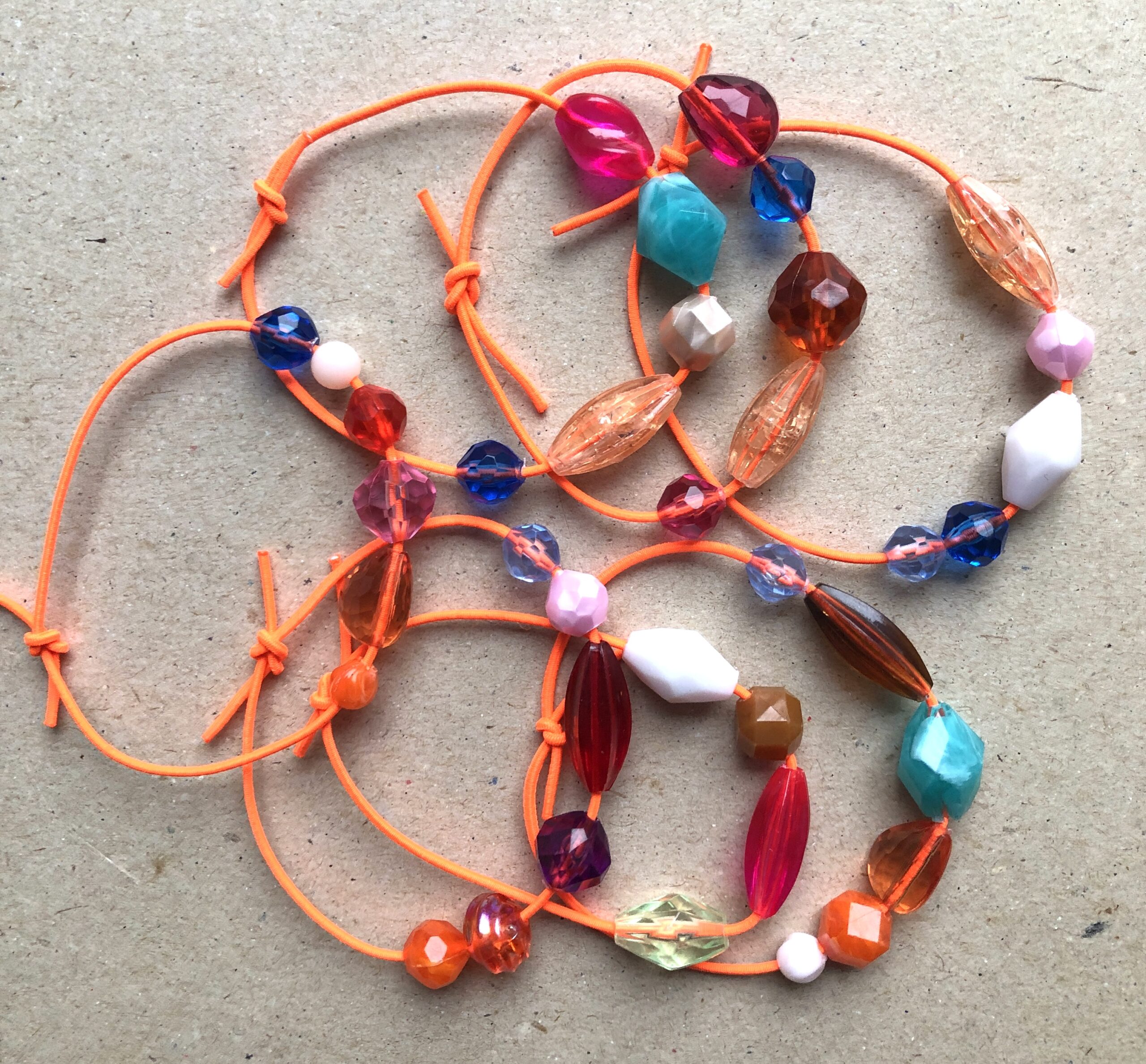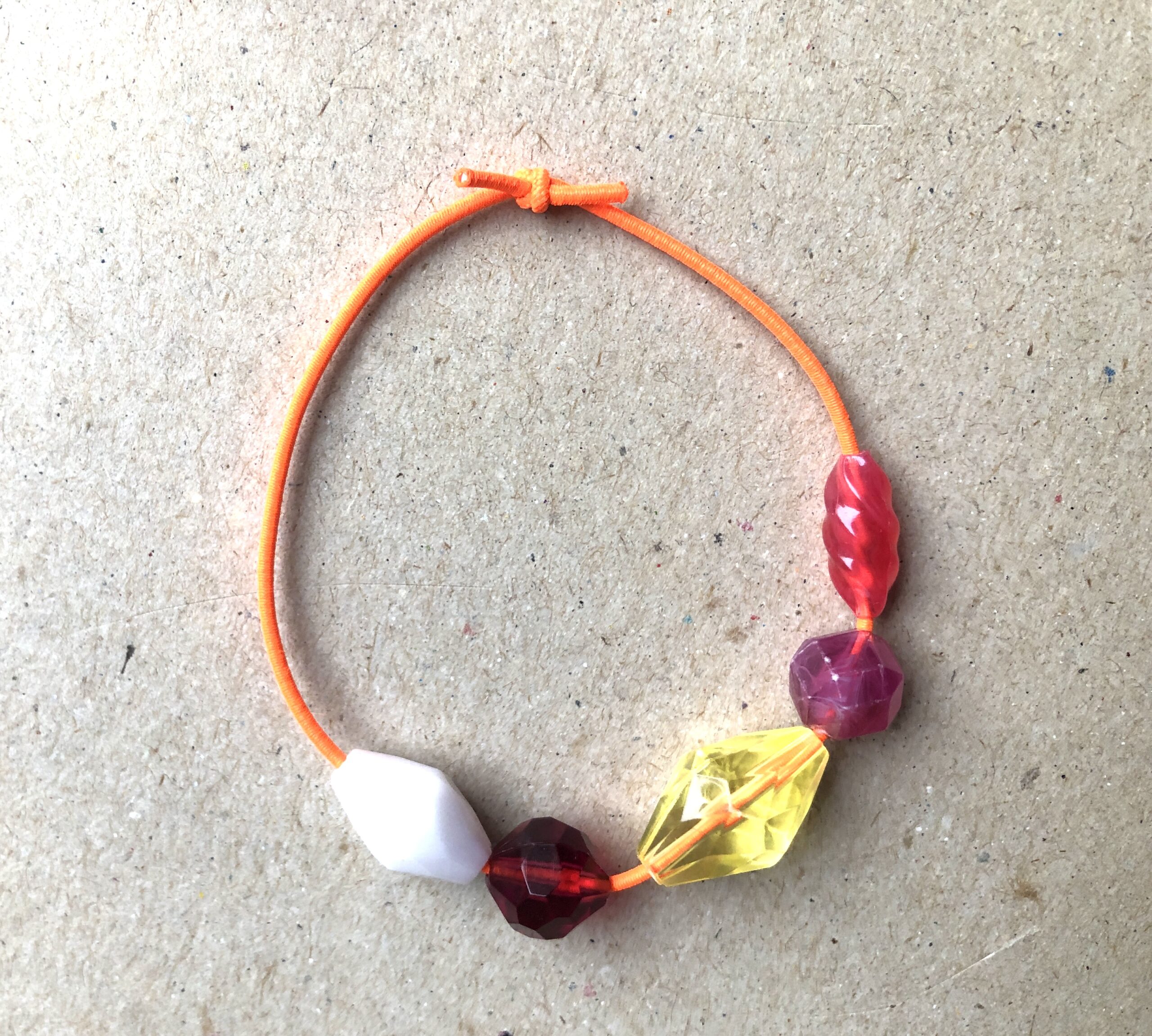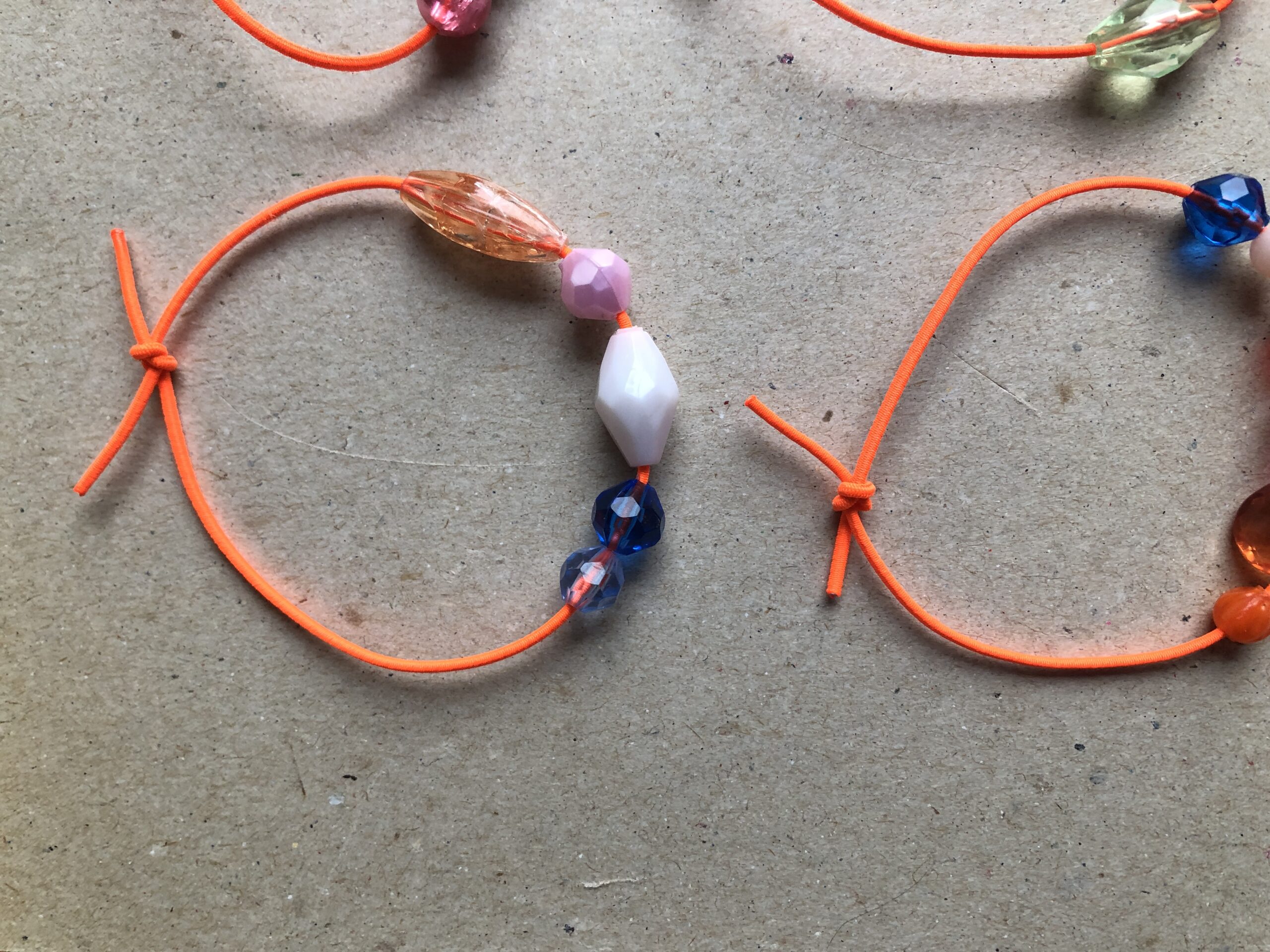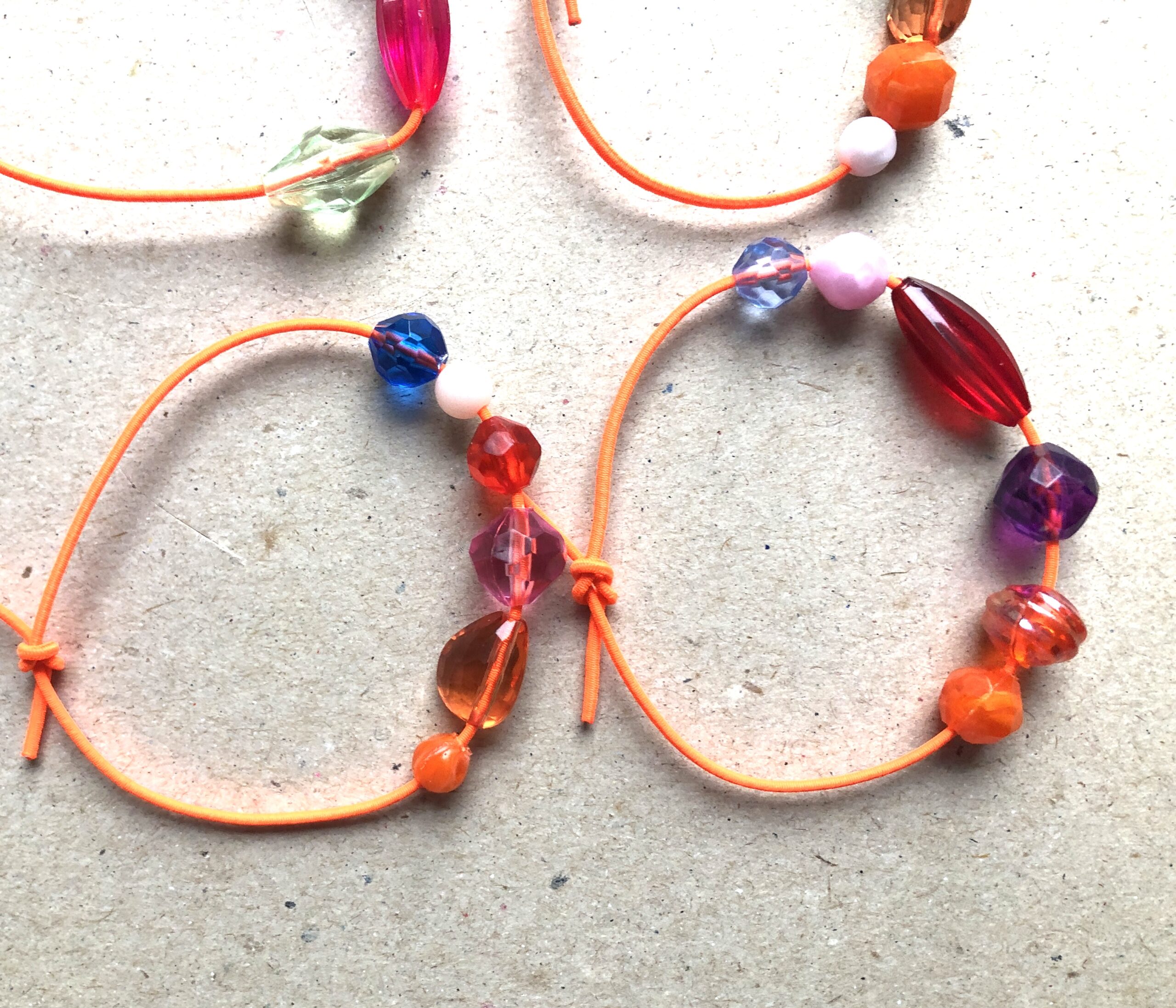 Armbändeli mit diversen Acrylperlen auf neon-orangem Gummiband.
