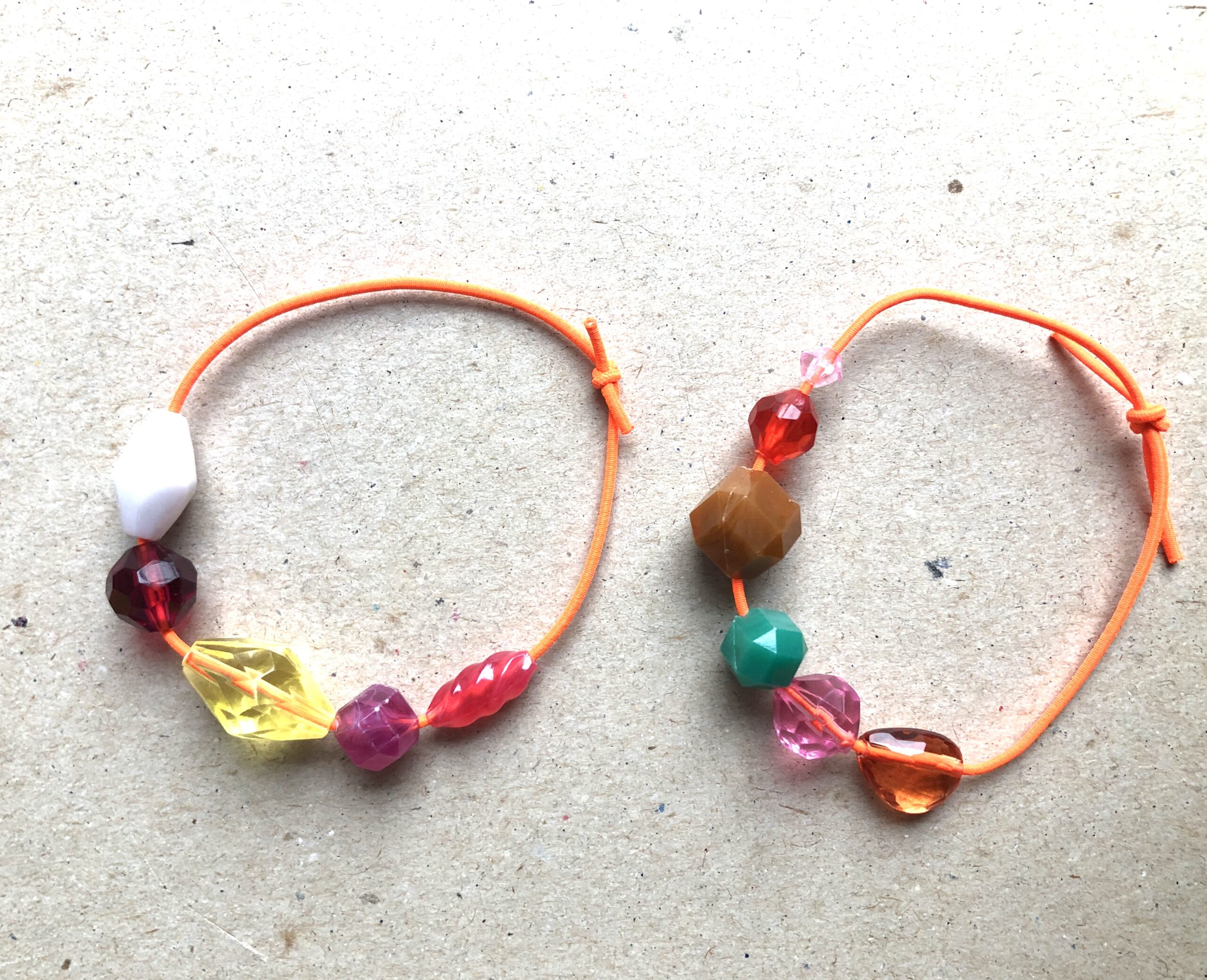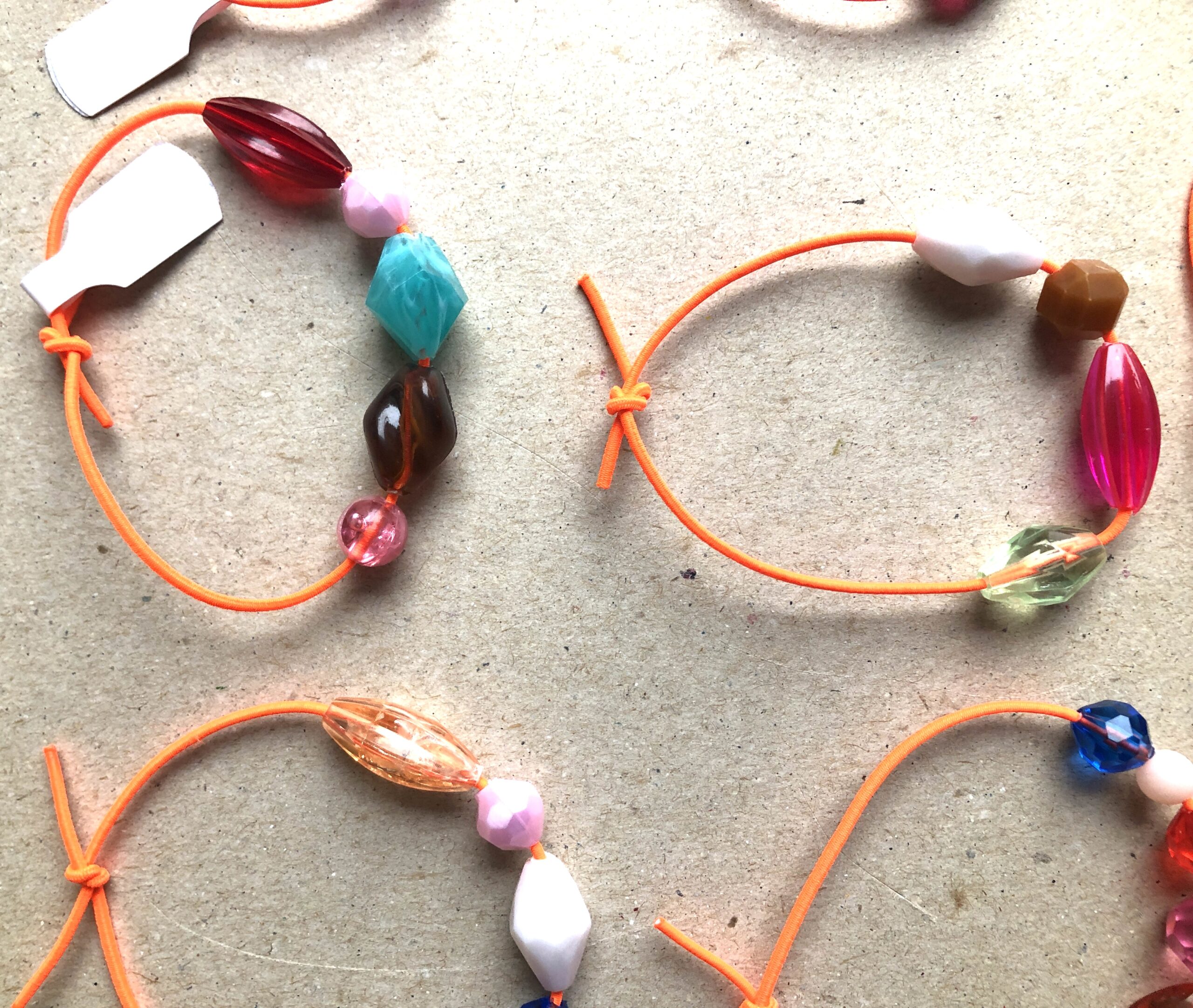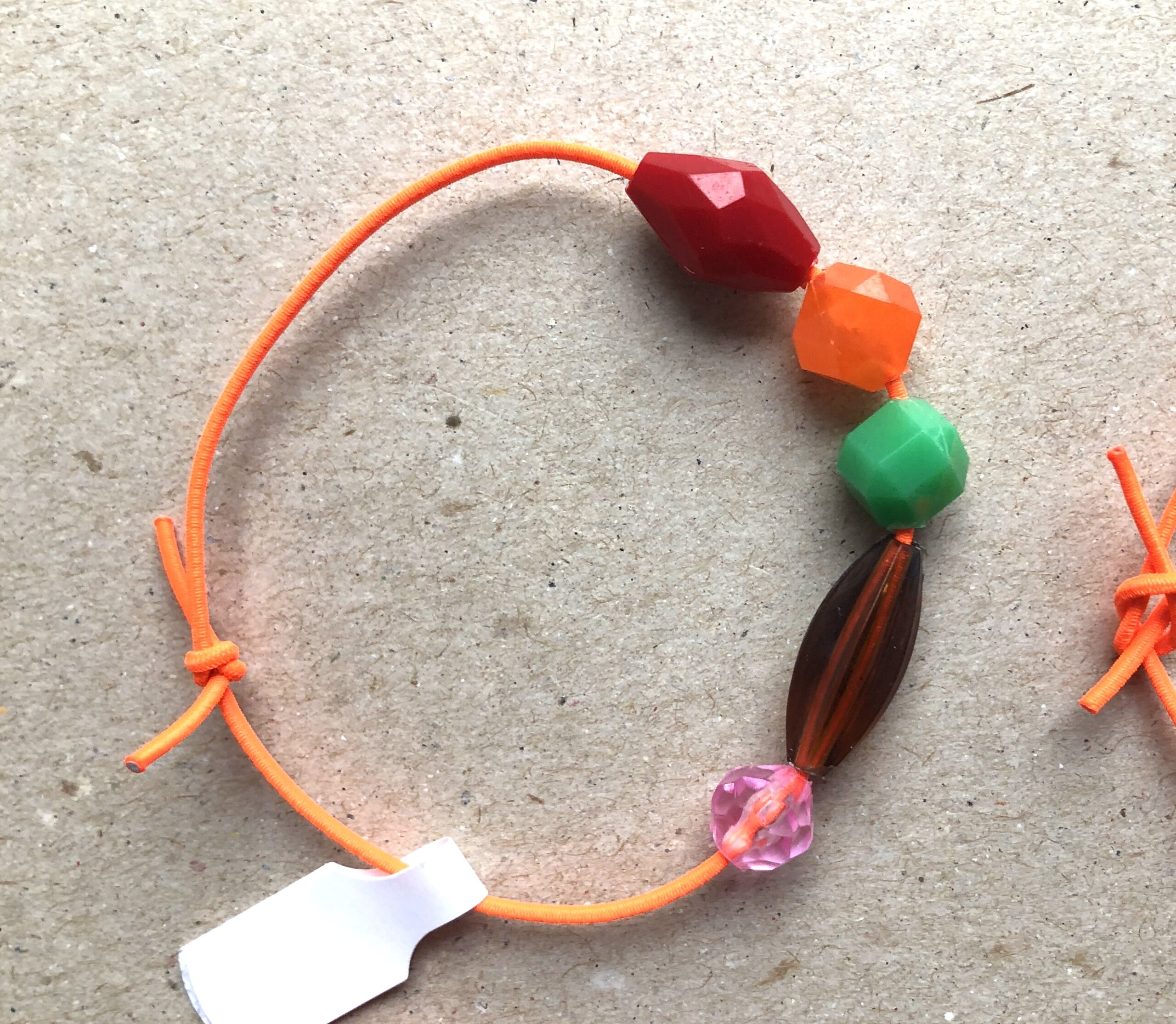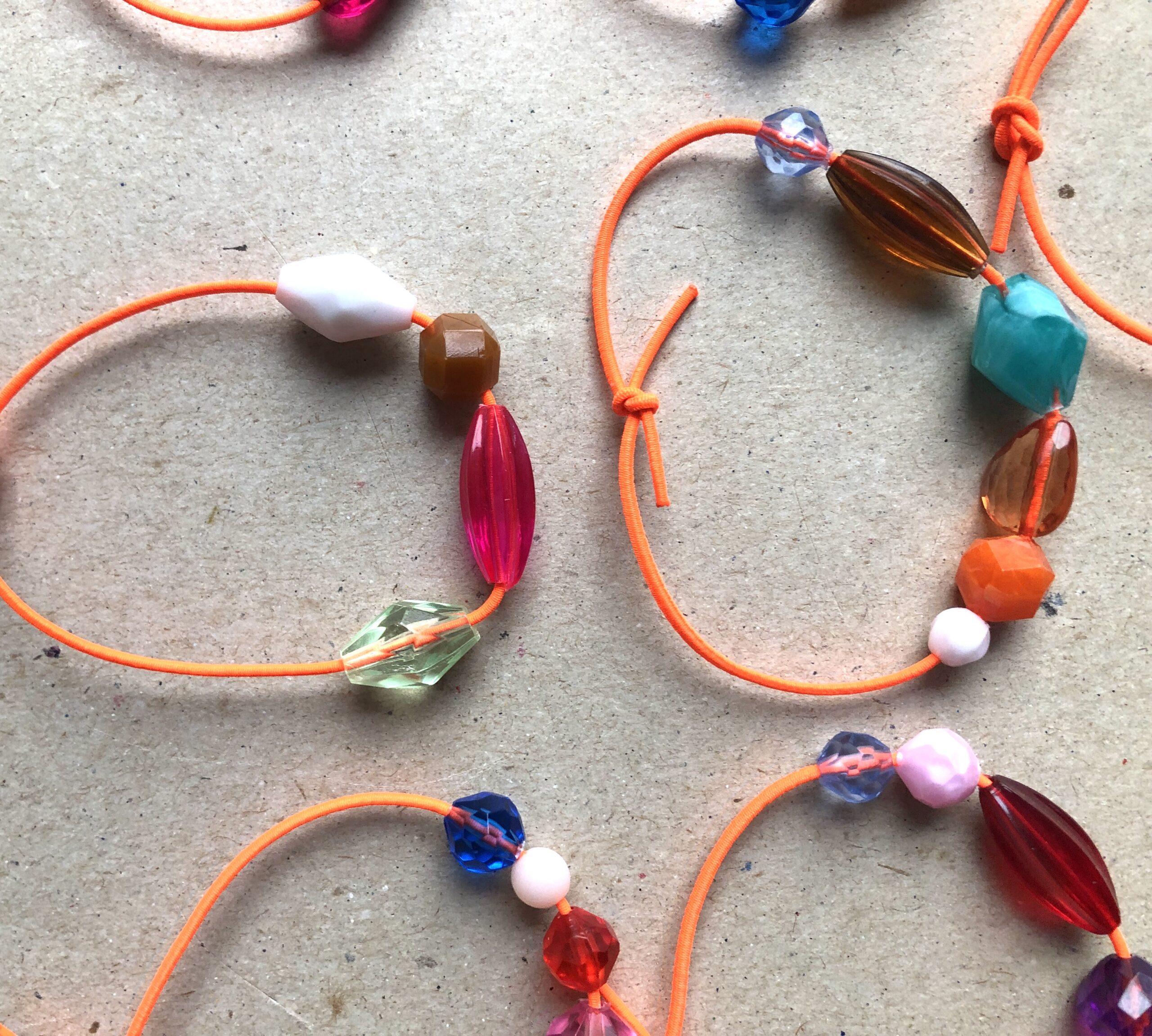 Armbändeli mit diversen Acrylperlen auf neon-orangem Gummiband.