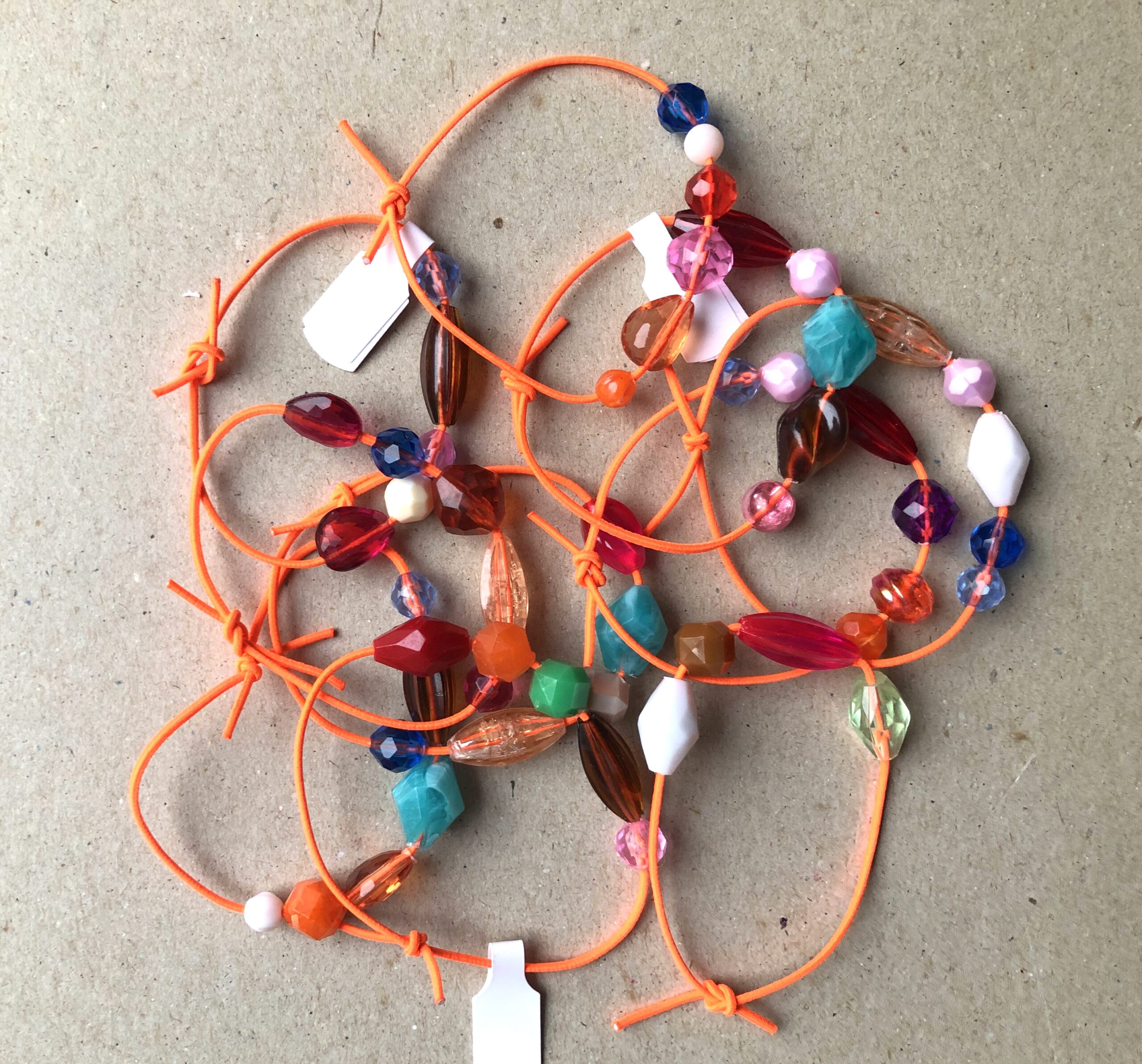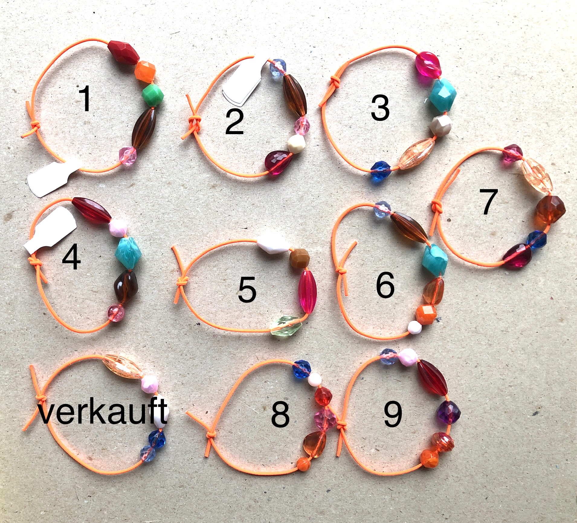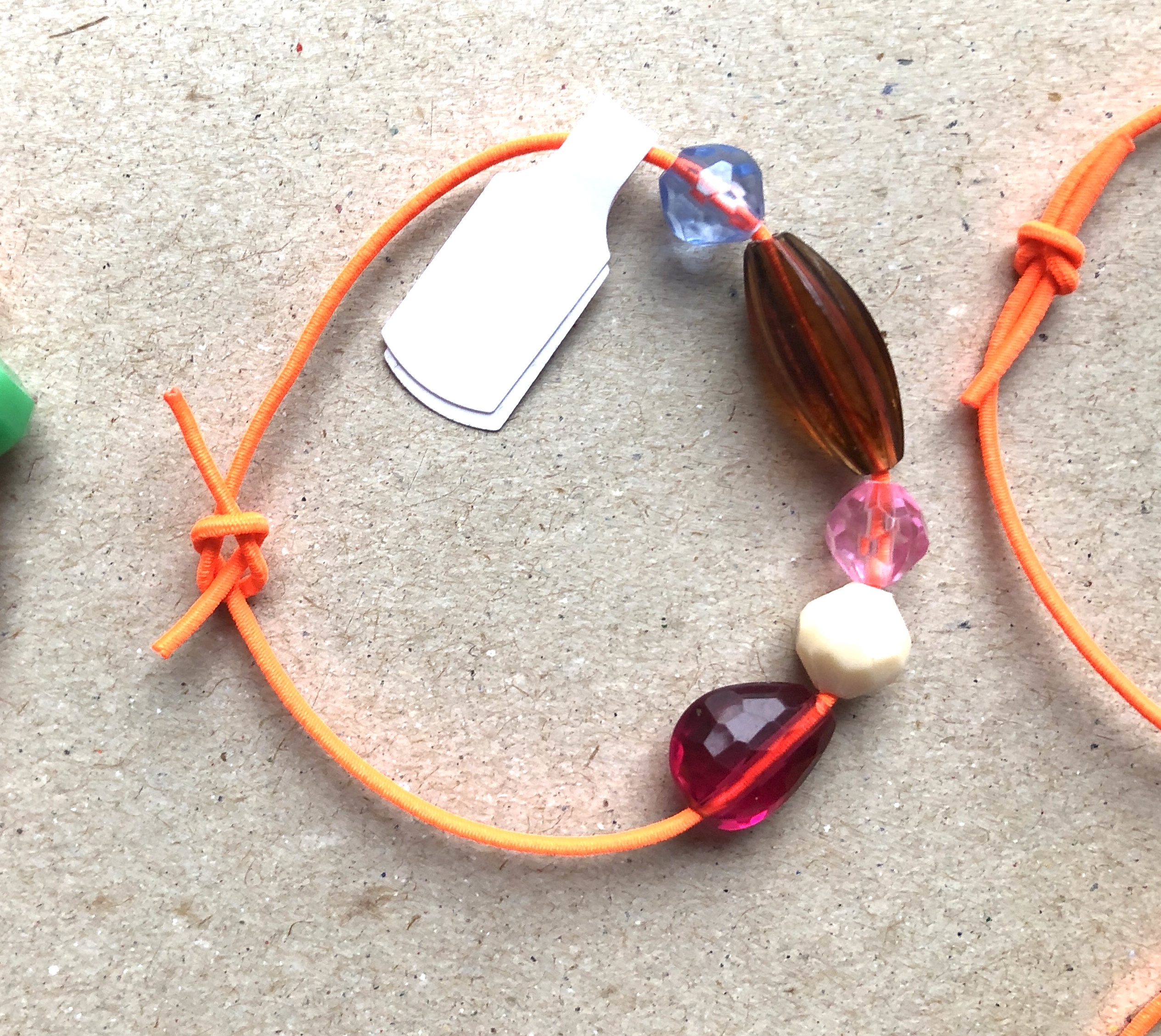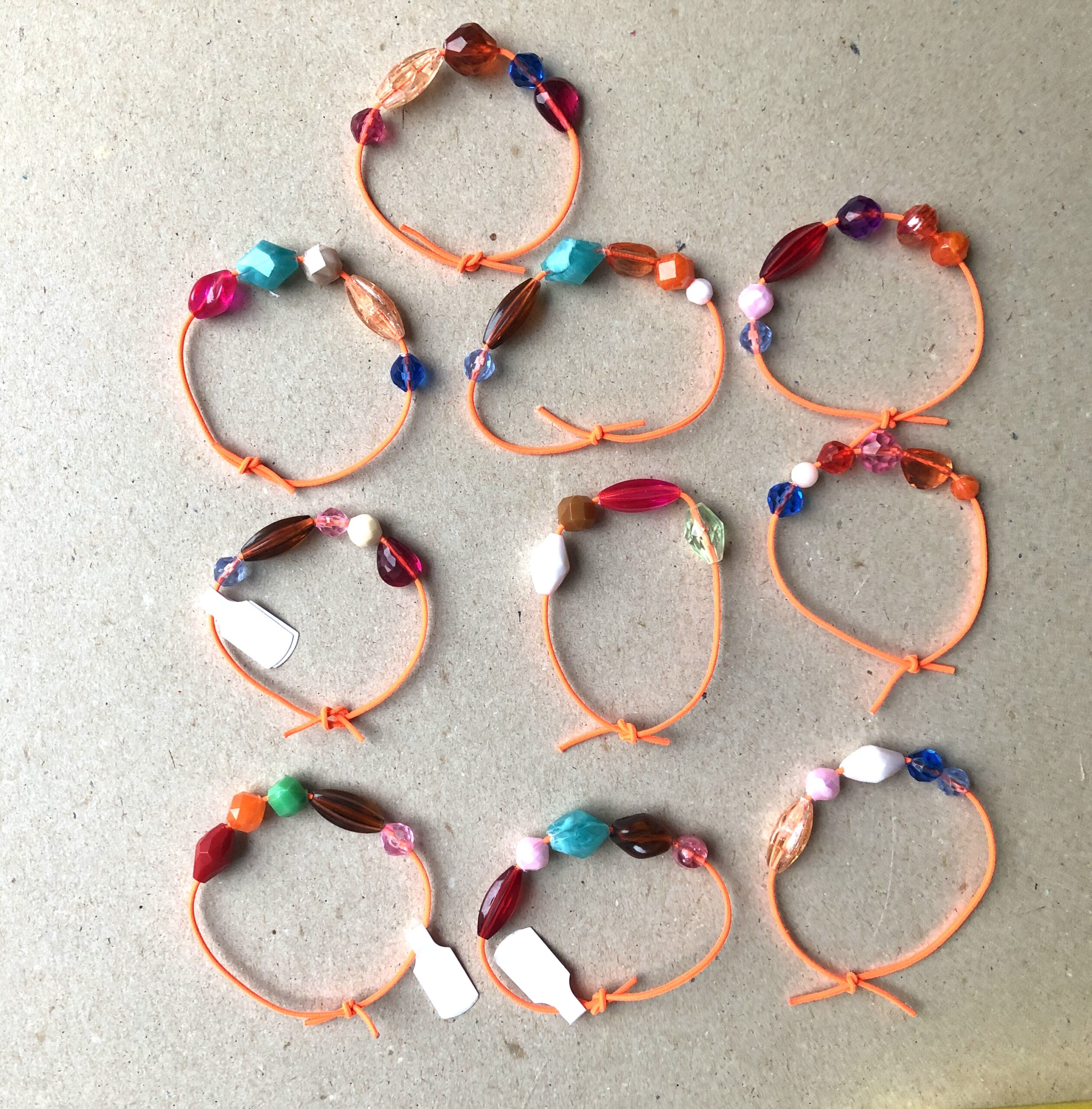 Armbändeli mit diversen Acrylperlen auf neon-orangem Gummiband.